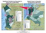 Viviana Camacho completed these maps in Geo 346: GIS Analysis of Environmental and Public Health in Fall of 2018, as part of a project investigating hot-spots of malaria and limitations of healthcare access in Colombia. Viviana found that in the years of 2007-2015, the administrative department of Choco had the highest cases of malaria in Colombia. Using buffer analysis, Viviana identified that a majority of cases were at least 15 miles away from healthcare facilities, contributing to the endemic and repeated cases of cholera. Viviana identified factors of poverty, illegal mining /deforestation and flooding which creates ideal habitat for mosquitoes carrying malaria, and although other departments in Colombia are seeing malaria cases stabilizing or decreasing, cases of malaria in Choco continue to rise. The lack of healthcare services in Choco available to indigenous and afro-columbian populations outside of urban areas is suggested by Viviana to be a large part of the reason that malaria continues to be a serious problem in Choco.